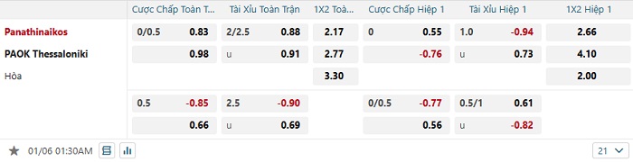 Tip kèo Châu Á hiệp 1 Panathinaikos vs PAOK