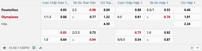 Tip kèo Châu Á hiệp 1 Panetolikos vs Olympiacos