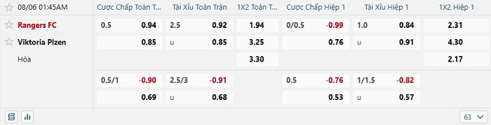 Tip kèo Châu Á full trận Rangers vs Viktoria Plzen