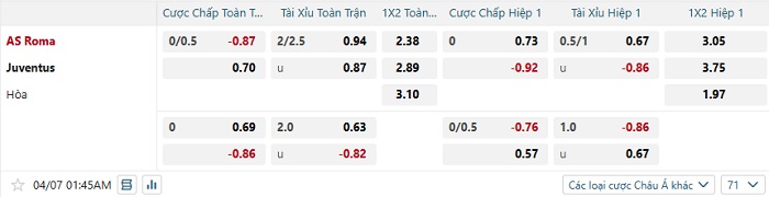 Tip kèo Châu Á hiệp 1 Roma vs Juventus