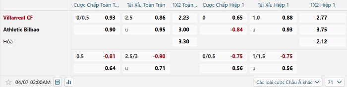 Tip kèo Châu Á full trận Villarreal vs Bilbao