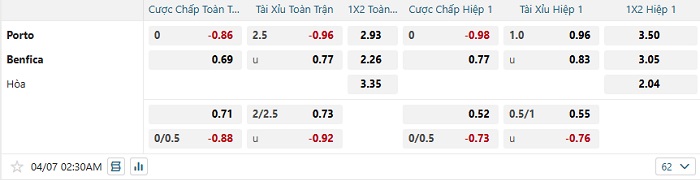 Tip kèo Châu Á hiệp 1 Porto vs Benfica