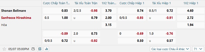 Tip kèo Châu Á hiệp 1 Shonan Bellmare vs Sanfreece Hiroshima