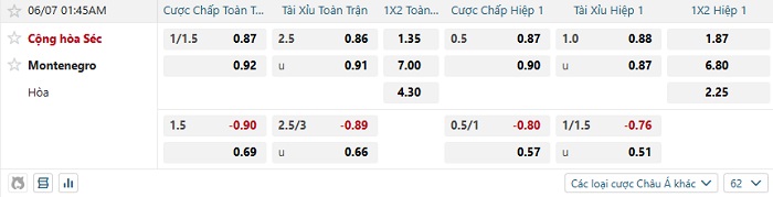Tip kèo Châu Á full trận CH Séc vs Montenegro