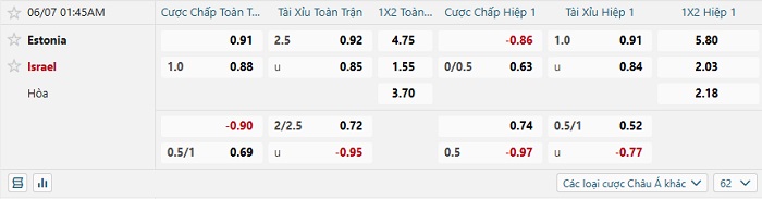 - Tip kèo cá cược Châu Á hiệp 1: Chọn Estonia +1/4