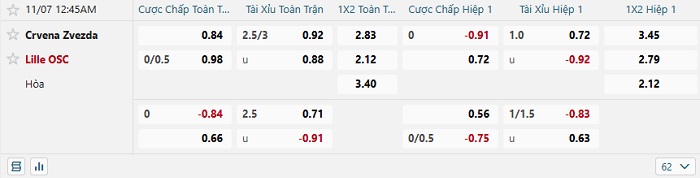 Tip kèo Châu Á hiệp 1 Crvena Zvezda vs Lille