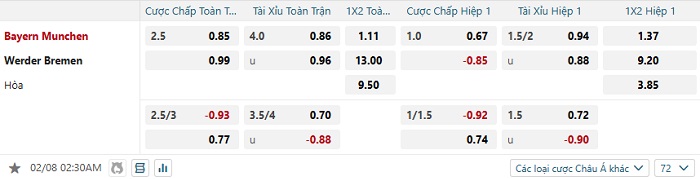 Tip kèo Châu Á hiệp 1 Bayern Munich vs Werder Bremen
