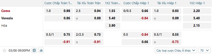 Tip kèo Châu Á full trận Como vs Venezia