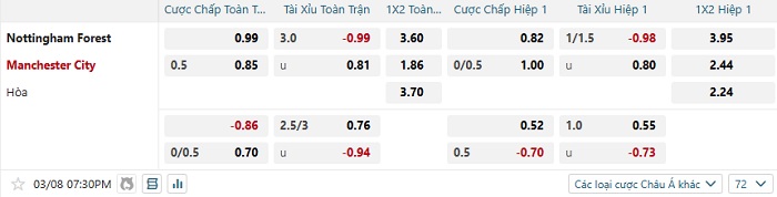 Tip kèo Châu Á hiệp 1 Nottingham vs Man City