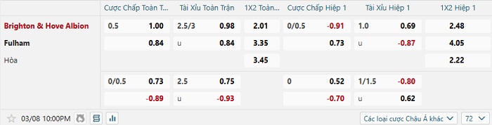 Tip kèo Châu Á full trận Brighton vs Fulham