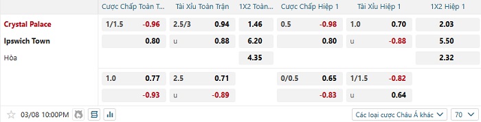 Tip kèo Châu Á full trận Crystal Palace vs Ipswich