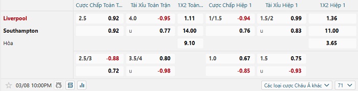 Tip kèo Châu Á full trận Liverpool vs Southampton
