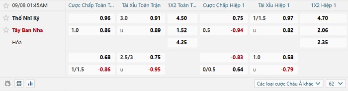 Tip kèo Châu Á hiệp 1 Thổ Nhĩ Kỳ vs Tây Ban Nha