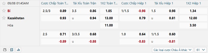 Tip kèo Châu Á hiệp 1 Bỉ vs Kazakhstan