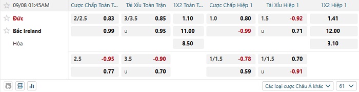 Tip kèo Châu Á hiệp 1 Đức vs Bắc Ireland