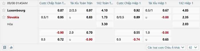 Tip kèo Châu Á hiệp 1 Luxembourg vs Slovakia