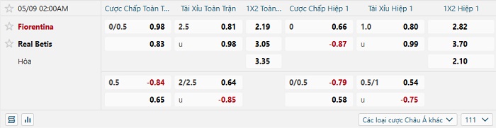Tip kèo Châu Á full trận Fiorentina vs Real Betis