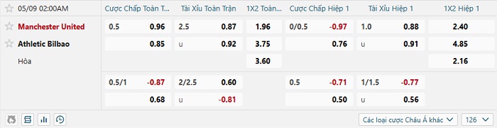 Tip kèo Châu Á hiệp 1 Man United vs Bilbao