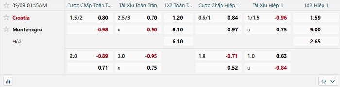 Tip kèo Châu Á hiệp 1 Croatia vs Montenegro