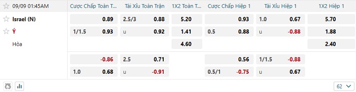 Tip kèo Châu Á hiệp 1 Israel vs Ý