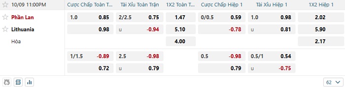 Tip kèo Châu Á hiệp 1 Phần Lan vs Lithuania
