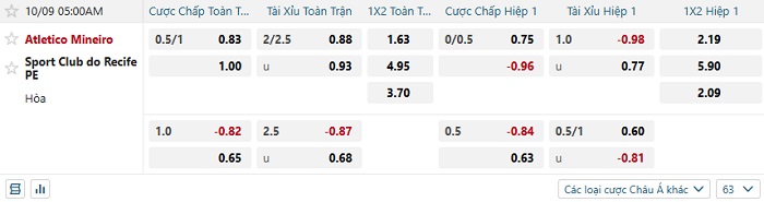 Tip kèo Châu Á hiệp 1 Atletico Mineiro vs Sport Recife