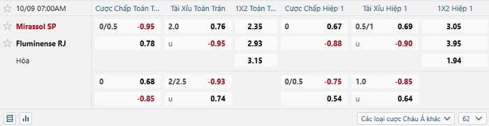 Tip kèo Châu Á full trận Mirassol vs Fluminense