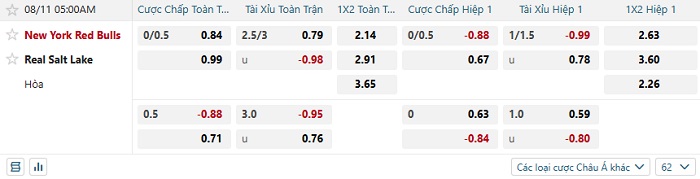 Tip kèo Châu Á full trận New York Red Bulls vs Real Salt Lake