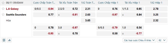 Tip kèo Châu Á full trận LA Galaxy vs Seattle Sounders