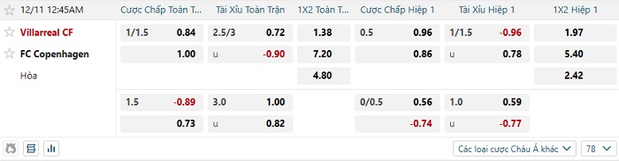 Tip kèo Châu Á hiệp 1 Villarreal vs Copenhagen