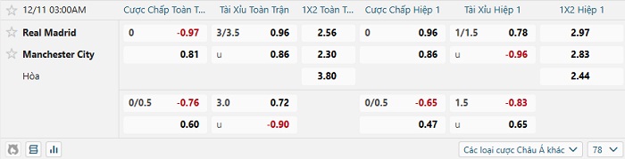 Tip kèo Châu Á full trận Real Madrid vs Man City