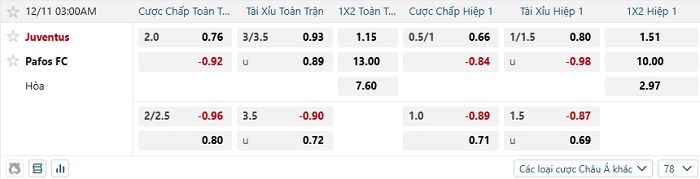 Tip kèo Châu Á full trận Juventus vs Pafos