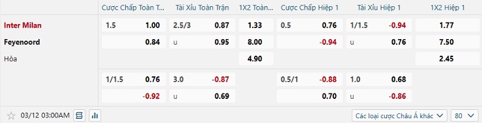 Tip kèo Châu Á full trận Inter vs Feyenoord
