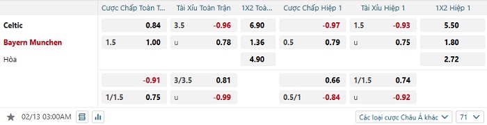 Tip kèo Châu Á hiệp 1 Celtic vs Bayern Munich