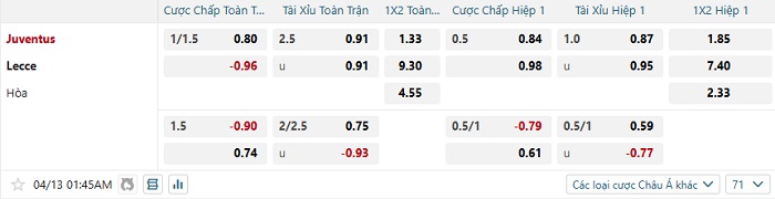 Tip kèo Châu Á hiệp 1 Juventus vs Lecce