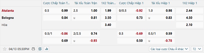 Tip kèo Châu Á full trận Atalanta vs Bologna