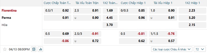 Tip kèo Châu Á full trận Fiorentina vs Parma