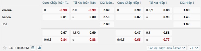 Tip kèo Châu Á hiệp 1 Verona vs Genoa