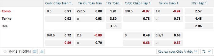 Tip kèo Châu Á hiệp 1 Como vs Torino