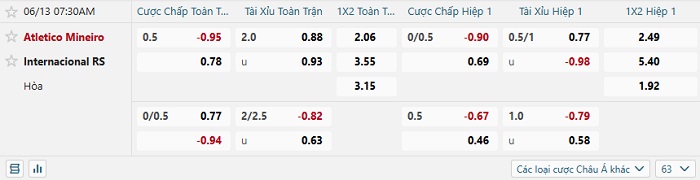 Tip kèo Châu Á full trận Atletico Mineiro vs Internacional