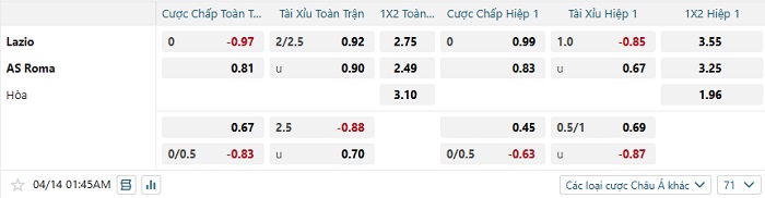 Tip kèo Châu Á hiệp 1 Lazio vs Roma