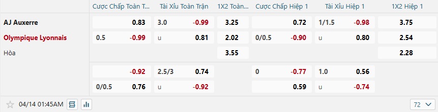 Tip kèo Châu Á full trận Auxerre vs Lyon