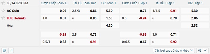 Tip kèo Châu Á full trận Oulu vs HJK Helsinki