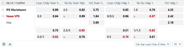 Tip kèo Châu Á hiệp 1 Mariehamn vs Vaasa VPS