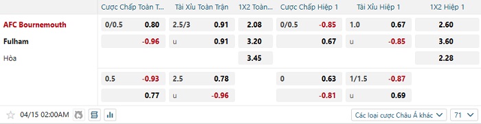 Tip kèo Châu Á hiệp 1 Bournemouth vs Fulham