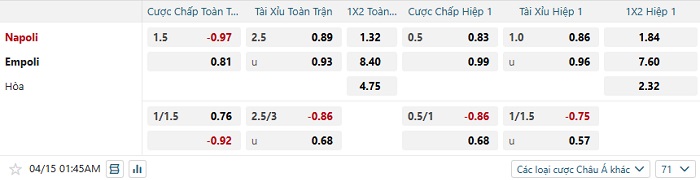 Tip kèo Châu Á hiệp 1 Napoli vs Empoli
