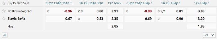 Tip kèo Châu Á full trận Krumovgrad vs Slavia Sofia