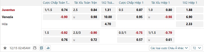 Tip kèo Châu Á hiệp 1 Juventus vs Venezia