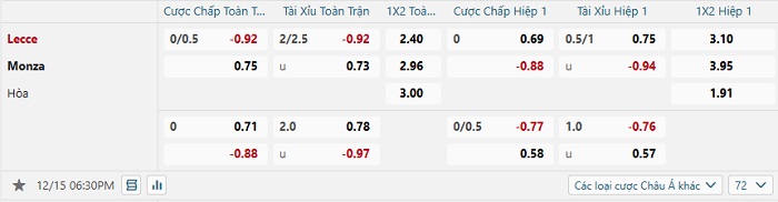 Tip kèo Châu Á hiệp 1 Lecce vs Monza