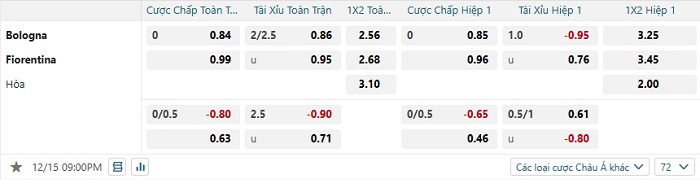 Tip kèo Châu Á full trận Bologna vs Fiorentina